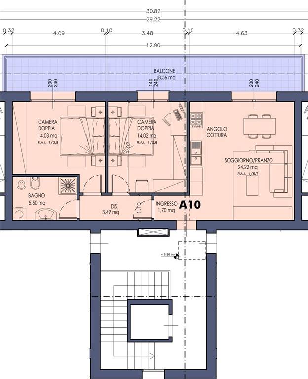 App.to così disposto: ingresso, soggiorno/pranzo con angolo cottura, balcone, disimpegno, due camere da letto e bagno con aerazione forzata.
