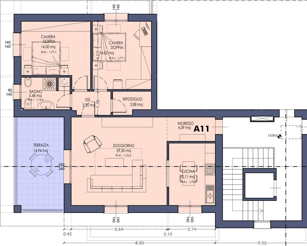 App.to così disposto: ingresso, soggiorno/pranzo, cucina, terrazza, disimpegno, due camere da letto, ripostiglio e bagno finestrato.