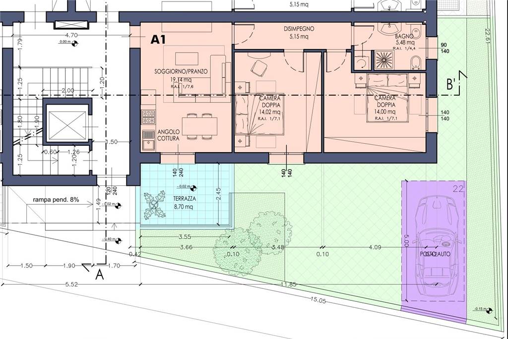 App.to così disposto: soggiorno/pranzo con angolo cottura, giardino con portico e posto auto, disimpegno notte, due camere da letto e bagno finestrato.