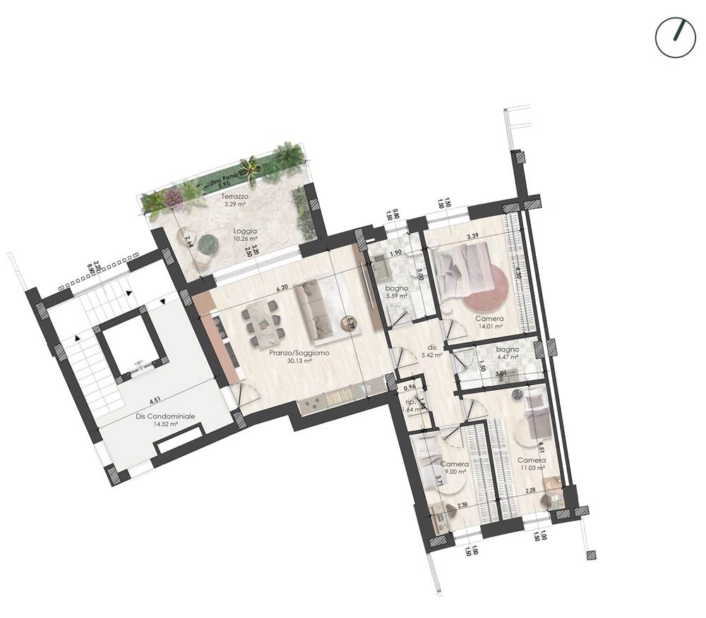 Appartamento così disposto: soggiorno/pranzo con cucina a vista, loggia coperta, giardino pensile, disimpegno, 3 camere da letto, due bagni (di cui uno cieco) e ripostiglio.