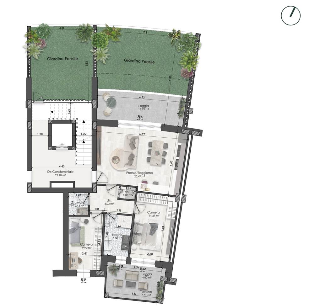 Appartamento così disposto: soggiorno/pranzo con cucina a vista, loggia coperta, giardino pensile, disimpegno, 2 camere da letto (di cui una dotata di seconda loggia coperta), due bagni (di cui uno cieco) e ripostiglio.