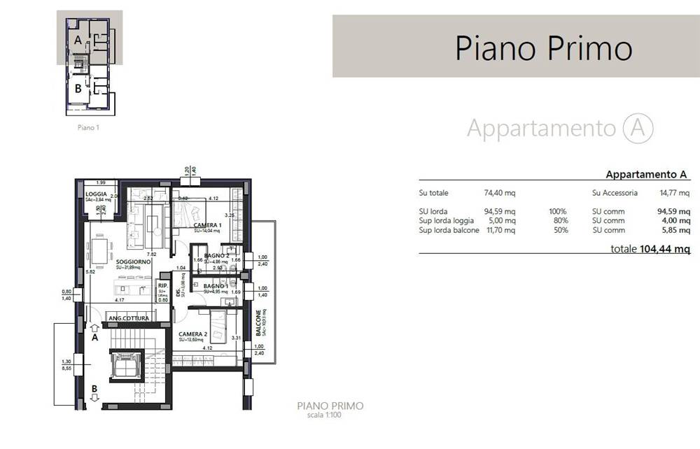 App.to così disposto: ingresso, soggiorno con cucina a vista e piccola loggia coperta, ripostiglio, dis. notte, due camere da letto matrimoniali e due bagni finestrati.
