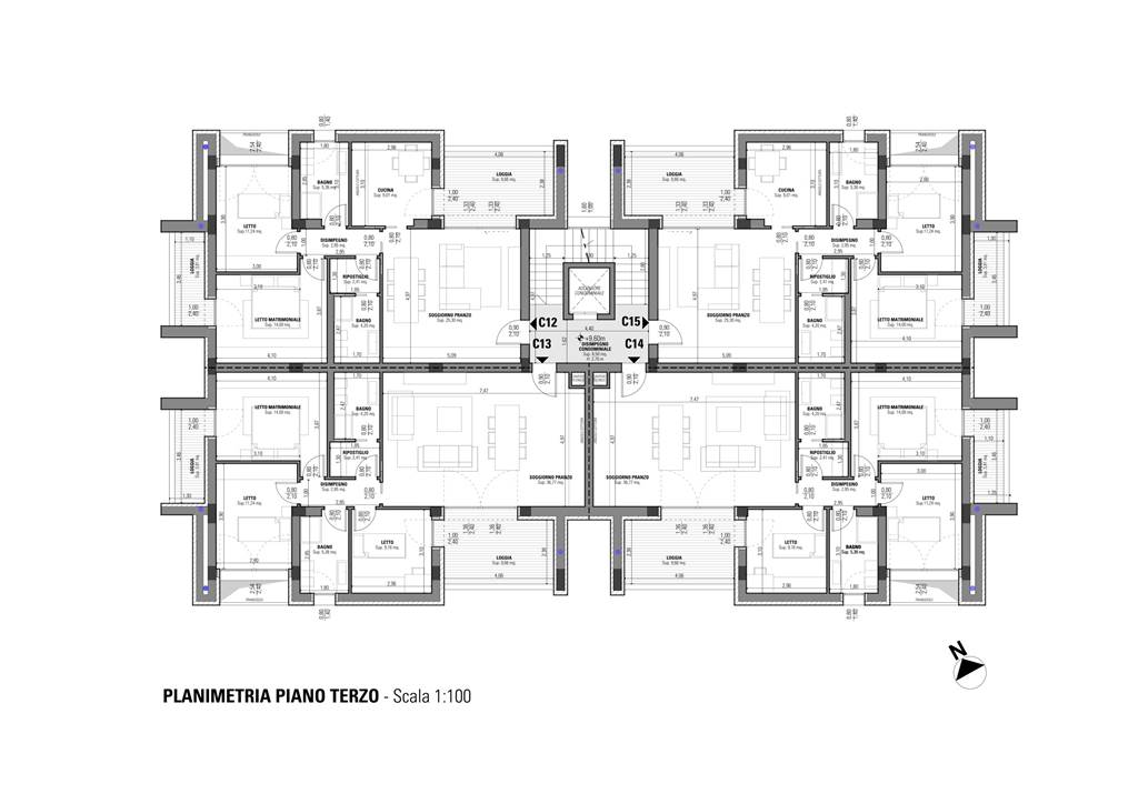 Appartamento così disposto: soggiorno/pranzo, loggia, cucina, disimpegno, due camere da letto (di cui una dotata di loggia), due bagni e ripostiglio.