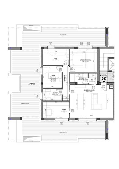 Appartamento così disposto: soggiorno/pranzo, cucina, disimpegno, tre camere da letto (con affaccio su terrazzo), due bagni, ripostiglio e ampio terrazzo perimetrale.